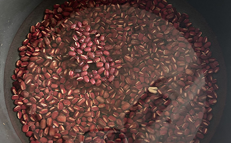 ③炊飯釜に小豆・水を入れて、「玄米モード」で炊く。小豆が指でつぶれる状態になればOK。