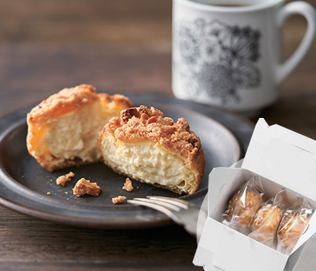 国産小麦粉のシュー生地にアーモンド入りのクッキー生地をのせて、香ばしく焼き上げました。