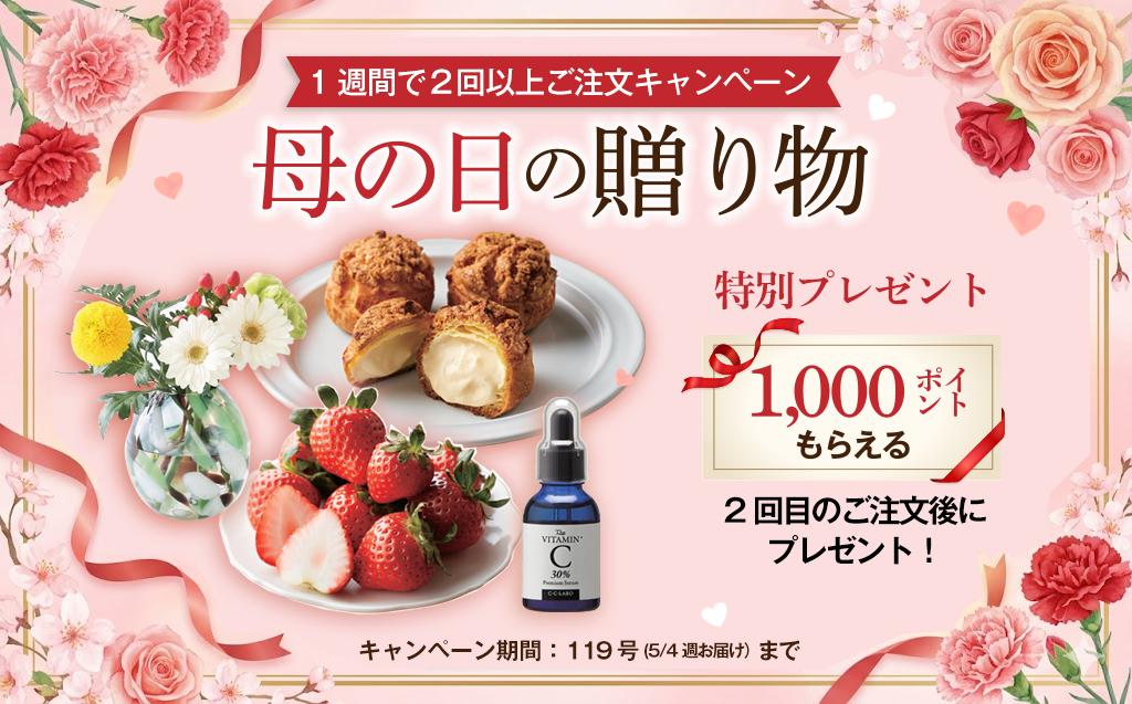119号(5/4週お届け)で、通常のお買い物(1回)の他に、2回目のお買い物をした方(※)全員にもれなく【1,000ポイント】を進呈します。母の日のギフトに、ぜひ大地を守る会をご利用ください。