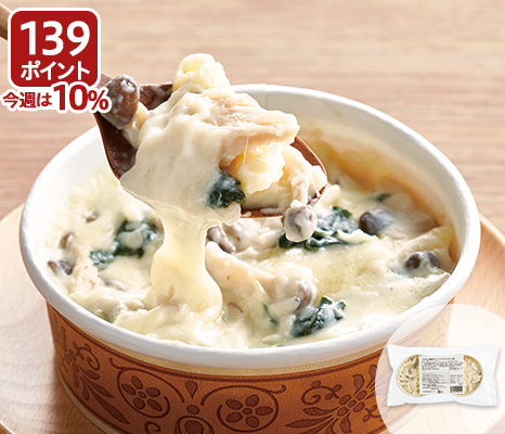 信州産のぶなしめじとエリンギ、国産チキンのうまみが、クリーミーな自家製ホワイトソースと絡み合っています。