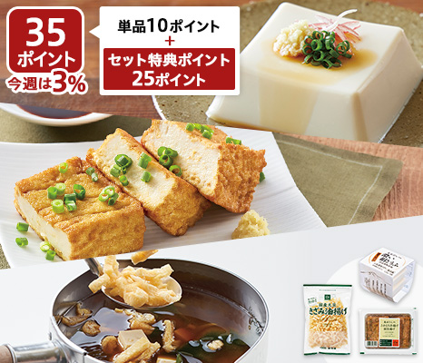 国産のなたね油で揚げた絹生揚げ、豆乳濃度14%の濃厚な絹豆腐、刻んで冷凍した国産大豆の油揚げをセットにしました。
