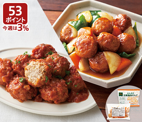 豆腐を加えたふんわり食感が人気の鶏肉団子。定番の「甘酢ダレ」と昨年登場した「洋風トマトソース味」をお届けします。