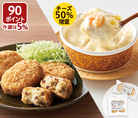 お値段そのまま、チーズが通常品比50%増量中のグラタンと、国産のじゃがいもと合挽肉で作ったコロッケのセット。