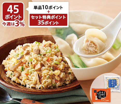 国産の豚肉とキャベツ入りの具材を、国産小麦の皮で包んだ水餃子に、国産の野菜、豚肉を使ったチャーハンをご一緒に。