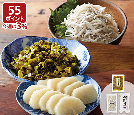 原料にこだわった高菜漬け、べったら漬けに、規格外の大きなものが混じる大地のもったいナイシラス干しをセット。