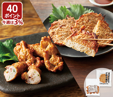 仙台味噌に漬けた国産ごぼうたっぷりのごぼう揚げと、魚肉のすり身にイカとホタテを混ぜた海鮮揚げのセット。
