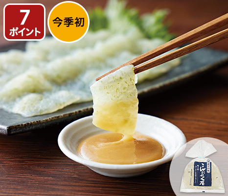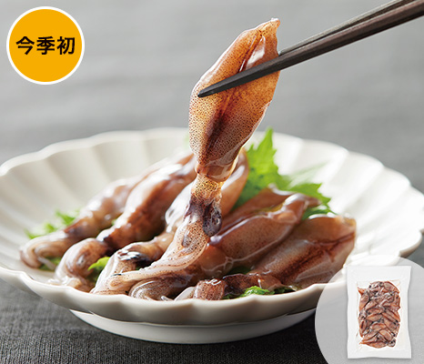 北海道産のスルメイカを、そうめん状にカット。かむほどに素材の甘みが広がります。刺身はもちろん、海鮮丼にしても。