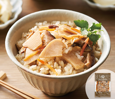 国産たけのこの食感を生かした炊き込みごはんの素です。2合のお米と炊くだけで、香り豊かな一品ができ上がります。