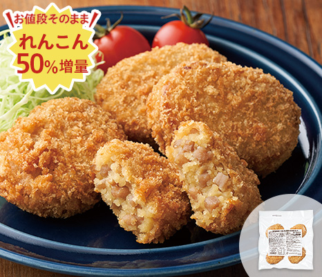 鹿児島県産さつまいもを使用したほくほくのコロッケです。食感のアクセントになるれんこんを、50%増量中!