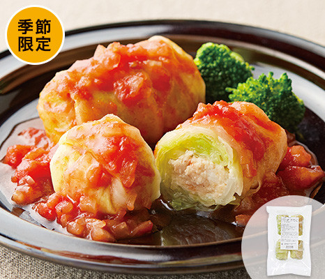 国産のキャベツを1コ1コ手巻きで仕上げたロールキャベツです。お肉は国産の鶏肉を使用し、あっさりと仕上げました。