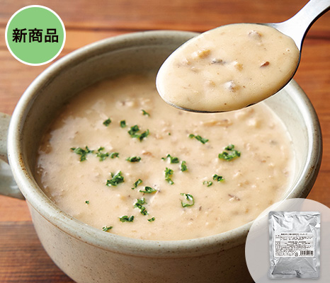 国産のしめじ、エリンギ、舞茸をすりつぶし、生クリームとバターで濃厚なポタージュに仕上げました。芳醇で奥深い味です。