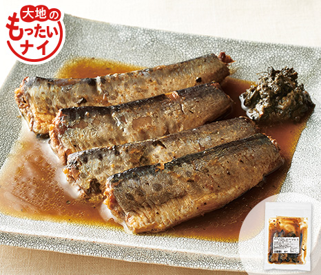 三陸で水揚げされた脂ののったイワシを、地元の老舗「八木澤商店」の醤油ともみしそで煮付けにしました。