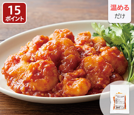 ぷりぷりの天然エビを使ったエビチリが手軽に食卓へ。チリソースの素となる、鶏ガラスープや発酵調味料も自社製です。