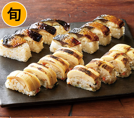 国産天然真さばを使った焼きさば棒寿司と、炙ることで香りと食感が抜群の筍棒寿司の2種セットです。