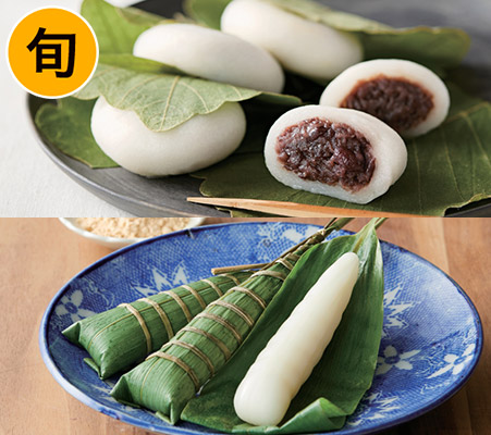 北海道産小豆使用粒あんの柏餅と、国産上新粉のもちもち食感のちまきのセット。柏と笹の葉が爽やか。