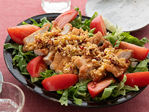 鹿児島県産のさつま悠然ハーブ鶏の唐揚げに、韓国風ヤンニョムソースを絡めました。ほどよい甘辛な味でみつきになります。