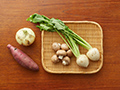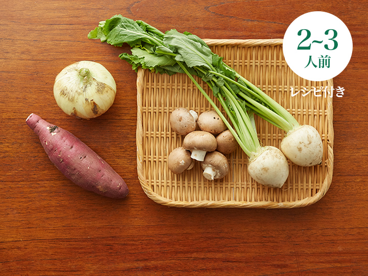 • かぶ200G、新玉ねぎ1コ、さつまいも(紅はるか)1コ、ブラウンマッシュルーム100G