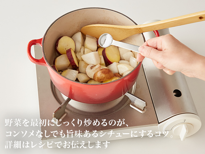 ふわ〜っと口いっぱいに感じる野菜の甘みのおかげで、ほっこりしたやさしいおいしさ。新玉ねぎが甘みを底上げし、コンソメも市販のルウも使わないのに奥行きのある味! 野菜もたっぷりとれて心も体もご機嫌になれる一皿です。レシピ付き。(※ご用意いただきたい食材/牛乳・なたね油(なければ好みの油)・バター・小麦粉・塩・コショウ)