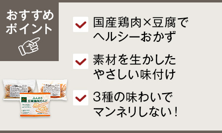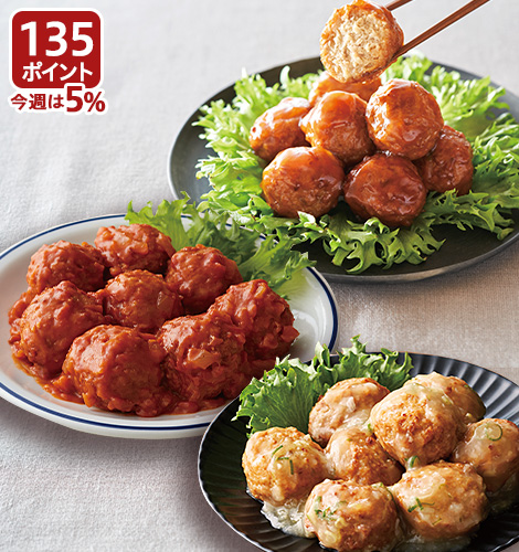 豆腐を加えてふわふわに仕上げた鶏肉団子です。定番の甘酢ダレ、洋風トマトソース味、コクうま塩だれ味の3種セット。