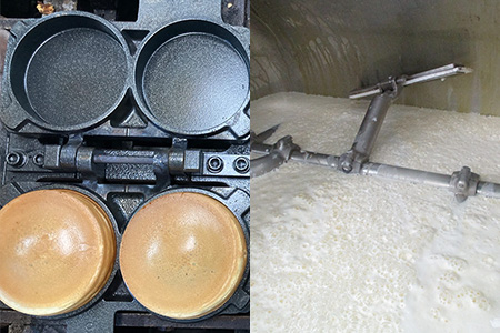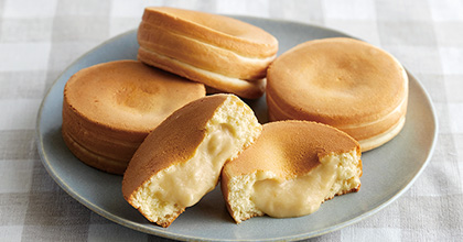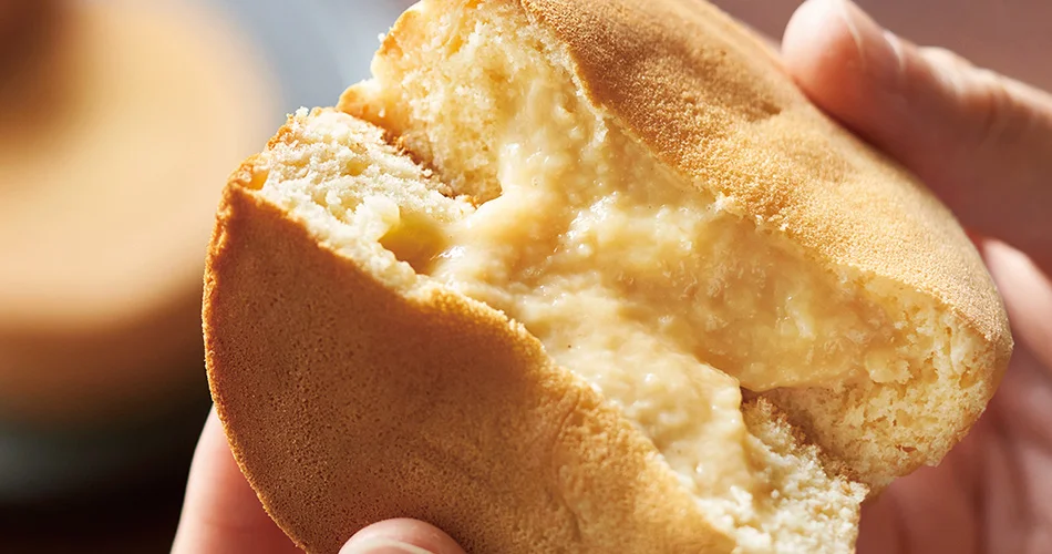人気商品「北海道産小豆の今川焼(粒あん)」同様、国産小麦を使い、自社配合で皮を焼き上げています。本品の皮にははちみつを加え、カスタードと相性の良いしっとり・もちもちとした食感の生地を目指しました。