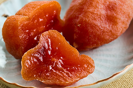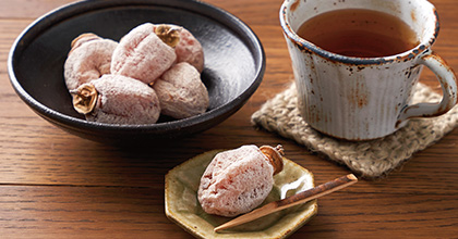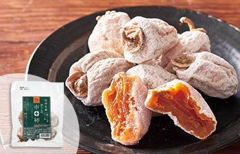 表面に付いている白い粉は、干す際に乾燥して結晶化したぶどう糖。柿本来の甘みだけが凝縮しているので、濃厚ながらも後味はすっきりとして上品。「まるで高級和菓子のよう」と好評です。