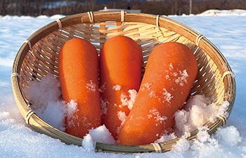 冬には銀世界が一面に広がる雪国・真狩村ならではの一品です。今年も積雪状況はほぼ例年並みで、本来秋堀である人参を収穫せずそのまま深い雪の下で越冬させたことにより、糖分がしっかりと蓄えられました。この時季にしか味わえない澄んだ甘みをぜひお楽しみください!