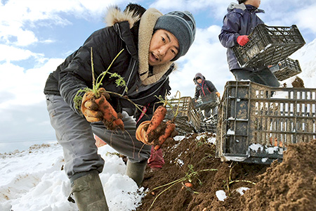 ▲ ベジタブルワークス代表の佐々木 伸さん。約2mもの雪から人参を掘り起こすのは重労働ですが、「毎日の食卓で季節を感じ、食を楽しんでもらいたい」という想いのもと続けています。
