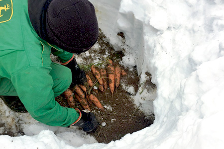 ▲ 深く降り積もった雪の中から、人参を掘り起こします。雪の下の土は乾燥しづらいため、みずみずしく仕上がります。