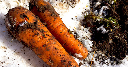 北海道・真狩(まっかり)村で育った「雪下人参」です。北海道の人参は夏に種をまき、秋に収穫するのが一般的ですが、これは秋にあえて収穫せずに3月まで畑で冬を越したものです。冬には畑の上に180cmほど雪が積もりましたが、その間も土の中でじっと春を待ちました。寒さに耐えるべく蓄えた糖分で、十分な甘みをお楽しみいただけます。