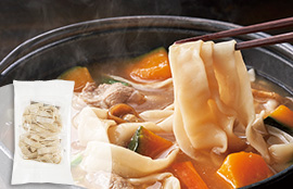 創業60年以上の東京都国立市の麺のプロ・亀製麺が作ったコシのあるほうとうです。粘り気と風味が強い国産小麦を使って、本場と同じようなもちもち食感を実現。スープの味噌の強く主張する味にも調和する、弾力のある食感とコシに仕上げました。