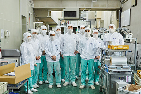 ▲ 亀製麺の製造者の皆さん。月に一度は従業員全員で試食会を開くなど、研究を欠かしません。