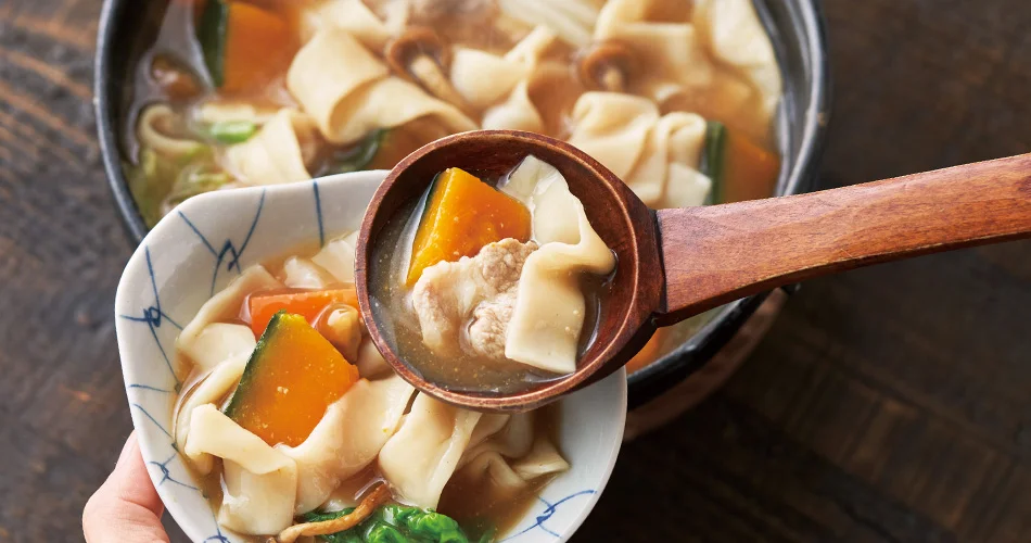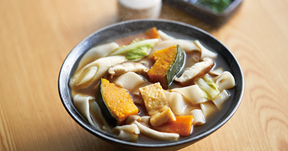 山梨県には「うまいもんだよ、かぼちゃのほうとう」という言いまわしがあるほど、かぼちゃはほうとうの代表的な具材です。かぼちゃを入れてぐつぐつ煮込めば次第にやわらかくなり甘みも一緒にスープに溶けます。隠れ人気食材・なめこもおすすめ。うまみ、つるっとした食感がスープ、麺によく合います。