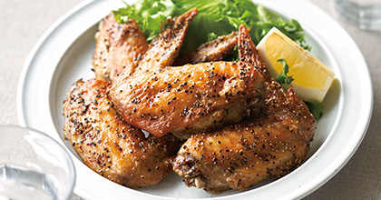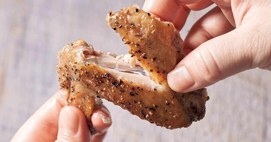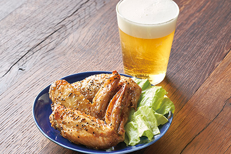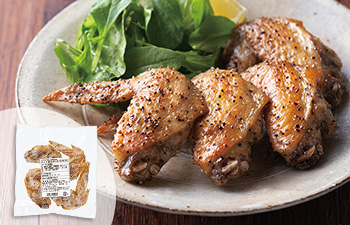 国産若鶏の手羽先を使用し、下味には塩や黒胡椒スパイスを効かせた調味液にチキンエキスをプラス。鶏肉本来のうまみを加え、食べごたえのある味付けに仕上げました。ていねいに仕込む下味が、一口食べると口いっぱいに広がるうまみの秘訣。