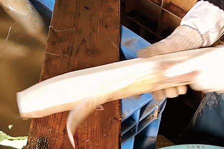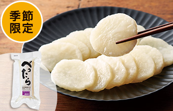 国産特別栽培大根は、泥を落とし、形を美しく保ちながら一本ずつ手作業で皮をむきます。増粘多糖類やアミノ酸などの調味料は使わず、国産有機麹をいかしたほのかな甘みを引き出しています。昔ながらのていねいな仕事で生み出される伝統の味をお楽しみください。