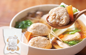 新潟県三条市の栄デリカが、新潟県産の鶏肉など、地元の食材を中心に作り上げた鶏肉団子。鶏ムネ・モモ肉に皮、生の玉ねぎやパン粉なども混ぜて、低温でじっくりと加熱しました。うまみが詰まった肉汁を内部にとどめたことで、ジューシーでふっくらとしています。