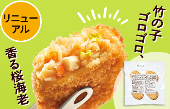 生冷凍から乾燥タイプの桜海老に変更することで、エビの風味をより強く感じられるように。さらに5mm幅だった竹の子も、倍の10mm幅カットにサイズアップ!シャキシャキ、ゴロゴロの食感がさらに引き立ちます。
