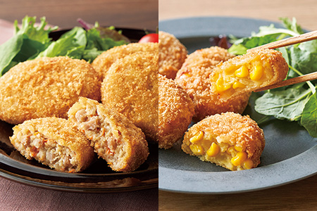 ▲ とうもろこしが限界までぎっしりの「たっぷりとうもろこしのコロッケ」(左)、ねっとり×シャキシャキの食感が好評だった「国産里芋と蓮根の冬コロッケ」(右)
