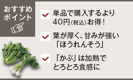どちらも今の時季は甘みが強く、やわらか。鍋物やおひたしなどいろいろな料理に使えます。