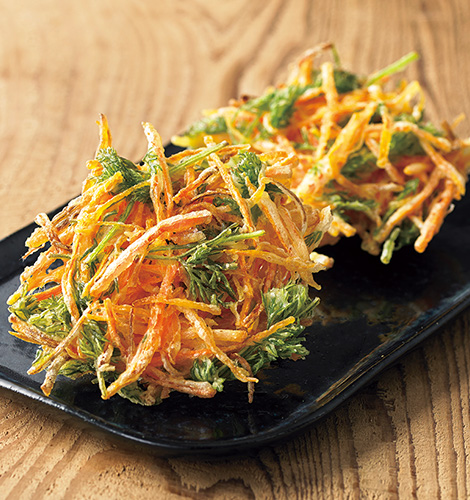 今だけ味わえる貴重な若葉。爽やかな香りの葉はかき揚げに、甘い実はグリルで。旬を丸ごとどうぞ。