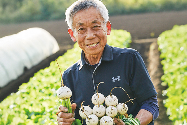 噛んだ瞬間、果汁が弾ける「春のサラダかぶ」。薄皮で柔らかく、生で皮ごと食べられるのは今だけです。雑味のない上品な甘みは、塩とオリーブオイルのマリネにもおすすめです。