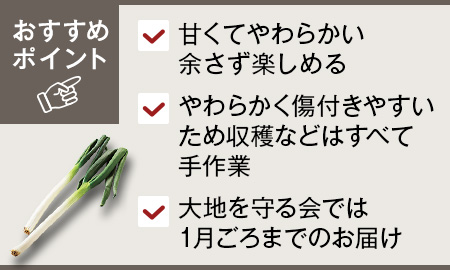京都の九条ねぎと、関東の千住ねぎの交配種で、青葉から白根まで甘く、やわらかいのが特徴です。