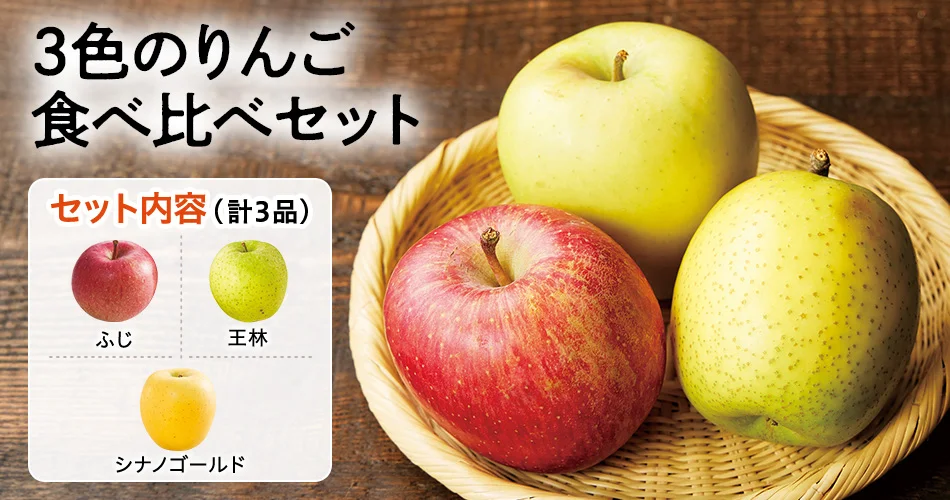 王道の真っ赤!甘くて果汁がたっぷりな「ふじ」、香り高く、酸味は少なめ爽快な味わいの「王林」、さっくり食感で甘みと酸味のバランスが良い「シナノゴールド」のセットです。年末の食卓に季節のフルーツを。