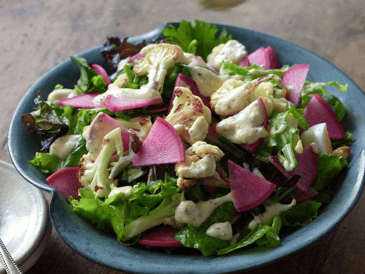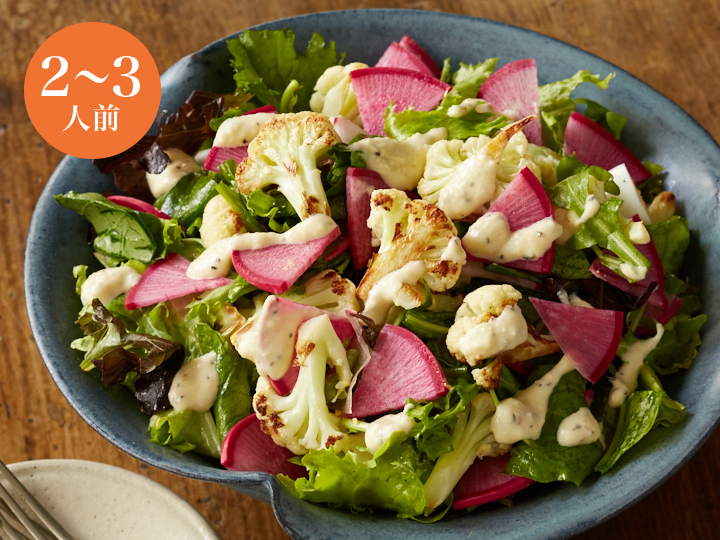 みずみずしくて優しい歯ごたえが魅力の紅くるり(赤大根)を主役にした、カラフルなサラダで食卓をパッと華やかに。手作りのシーザードレッシングが野菜のおいしさを引き立たせます。