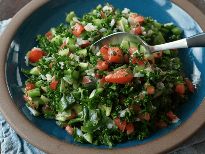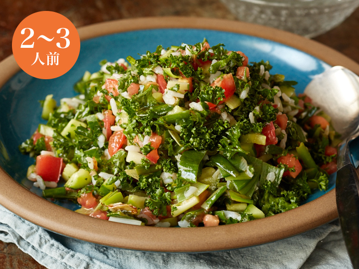 脇役だけじゃもったいない!大地を守る会のやわらかくておいしい有機パセリを主役に、いろいろな野菜をレモン汁・オリーブオイルで和えた中東発祥の一品。今回はクスクスの代わりにごはんを使って作ります。