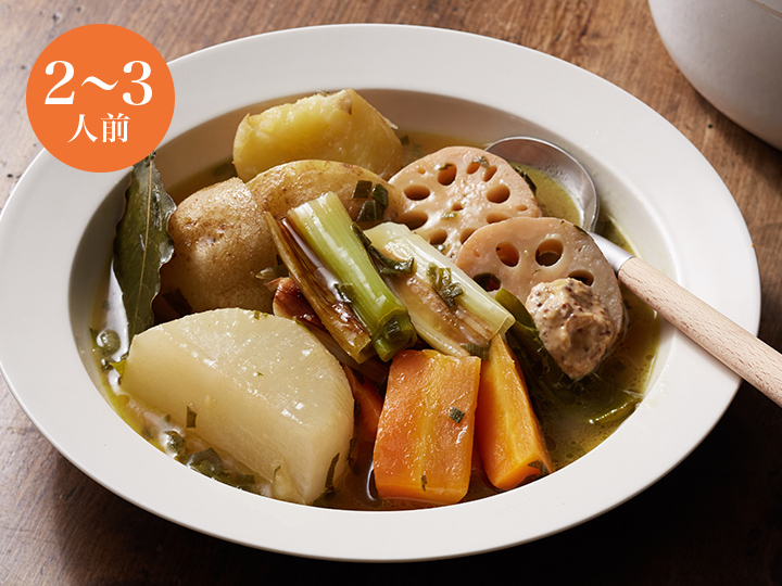 洋風ブイヨンやベーコンは使わずに、野菜のおいしさを引き出した出汁でいただくポトフ。やわらかくて加熱するほどに甘くなる三浦大根や加賀れんこんなどの根菜がたっぷり食べられる一皿です。