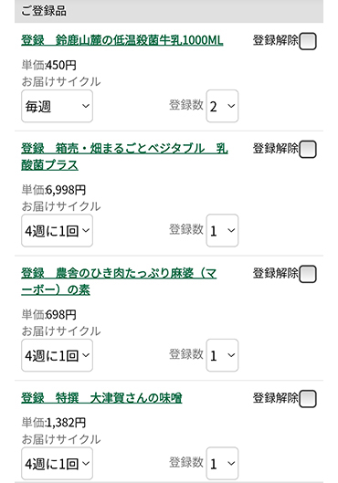 我が家の「大地を守る会サイトのマイページ」。ずらずらーっと登録品が並んでいます。
