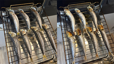 焼く前(左)と焼いた後(右)の比較。よく見ると、焼いた後のグリルには脂が滴っているのがわかりますか?