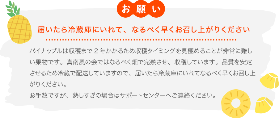 真南風の会では畑でギリギリまで完熟したパインをお届けします。