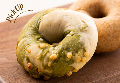 抹茶の生地とプレーンの生地をツイスト状に編み込んで焼き上げました。アクセントにチョコチップ入っております。見た目も可愛いベーグルです。
