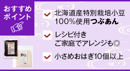 春のお彼岸にぴったり。「つぶあん」「もち米」「手作りぼたもちレシピ」の3点セットです。
